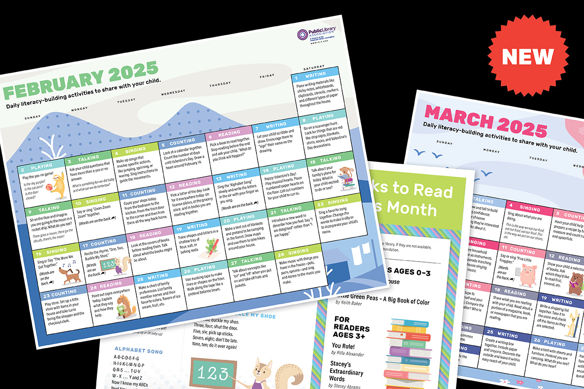 The Public Library Association releases an interactive calendar each year to promote early literacy skills. Daily activities help children with reading, writing, singing, talking, playing, and counting.